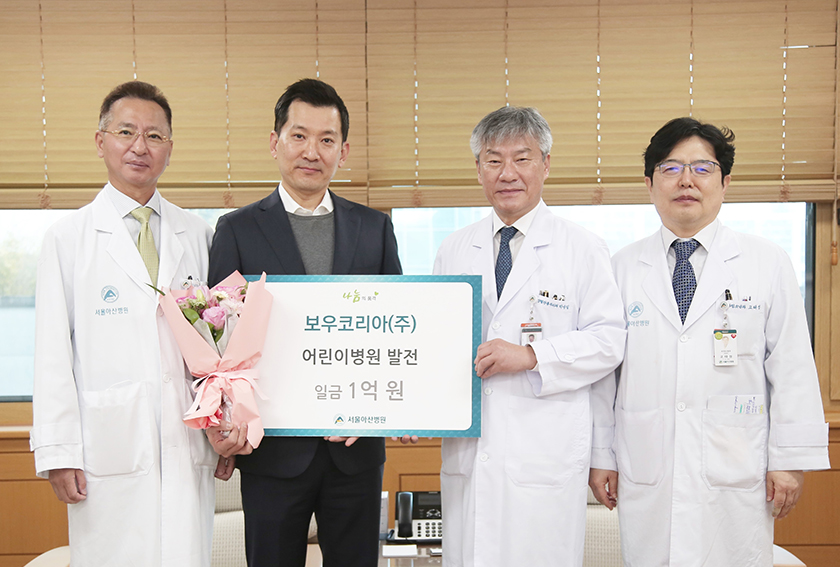 포장용 플라스틱 성형용기 제조업체인 보우코리아(주) 고준형 대표가 어린이병원 발전을 위해 병원발전기금 1억 원을 후원했다. 고 대표는 2011년부터 지속적으로 후원하고 있고 누적 후원금은 총 7억 5천만 원 이다. 2024년 1월 18일 진행된 감사패 증정식에는 고준형 대표, 박승일 병원장, 고태성 어린이병원장, 최재원 대외협력실장 등이 참석했다.