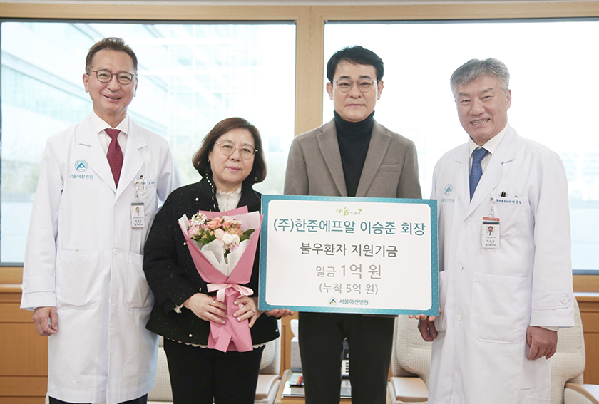(주)한준에프알 이승준 회장이 경제적으로 어려운 환자를 위해 불우환자 지원기금 1억 원을 후원했다. 이 회장은 2017년부터 지속적으로 후원하고 있고 누적 후원금은 총 5억 원이다. 2024년 2월 26일 진행된 감사패 증정식에는 이승준 회장, 배우자 송은경 님, 최재원 대외협력실장 등이 참석했다.